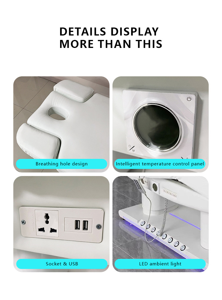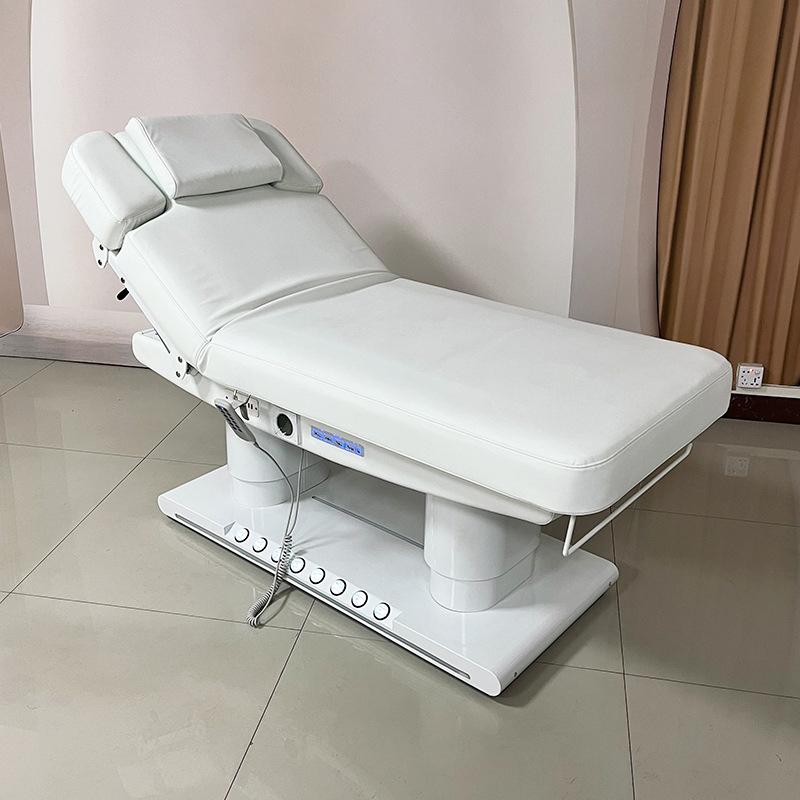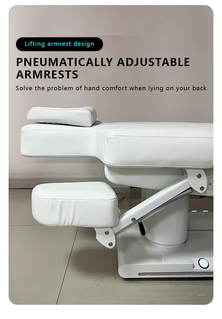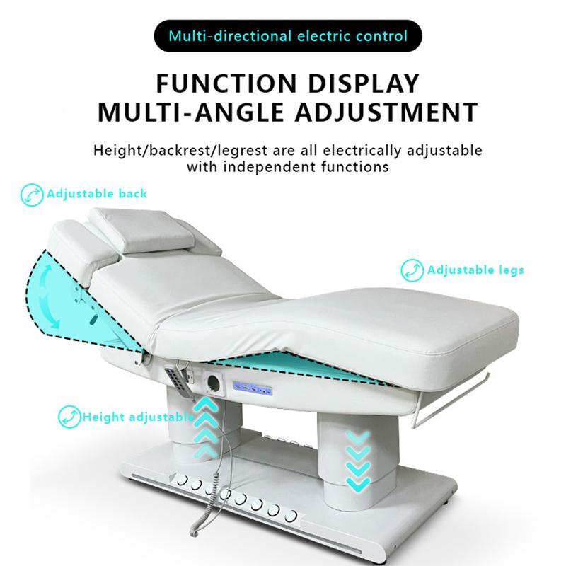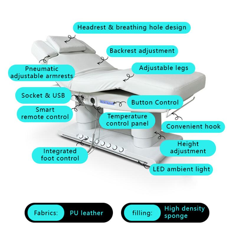 O Cama e mesa de massagem elétrica de beleza Possui quatro funções principais: ajuste de altura, apoio para as pernas (para cima e para baixo), encosto (para cima e para baixo) e inclinação geral. Também possui controle por pedal, luz ambiente e suporte para toalha.